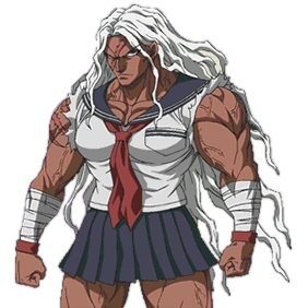 Her school uniform consists of a traditional seifuku style Japanese school uniform comprising of a white shirt a blue sailor collar, a short blue skirt, and a red tie. The sleeves on the uniform are torn off to make room for her muscular upper arms. She wears bandages wrapped around her calves and forearms. Her shoes are grey and resemble Uwabaki, with the kanji for her last name on the toe box.