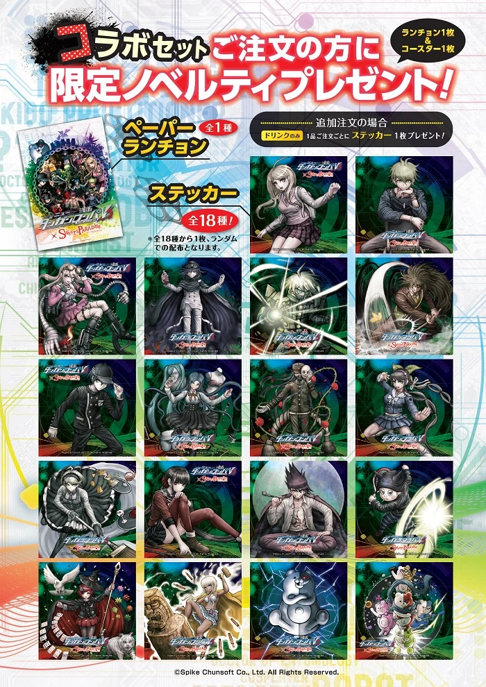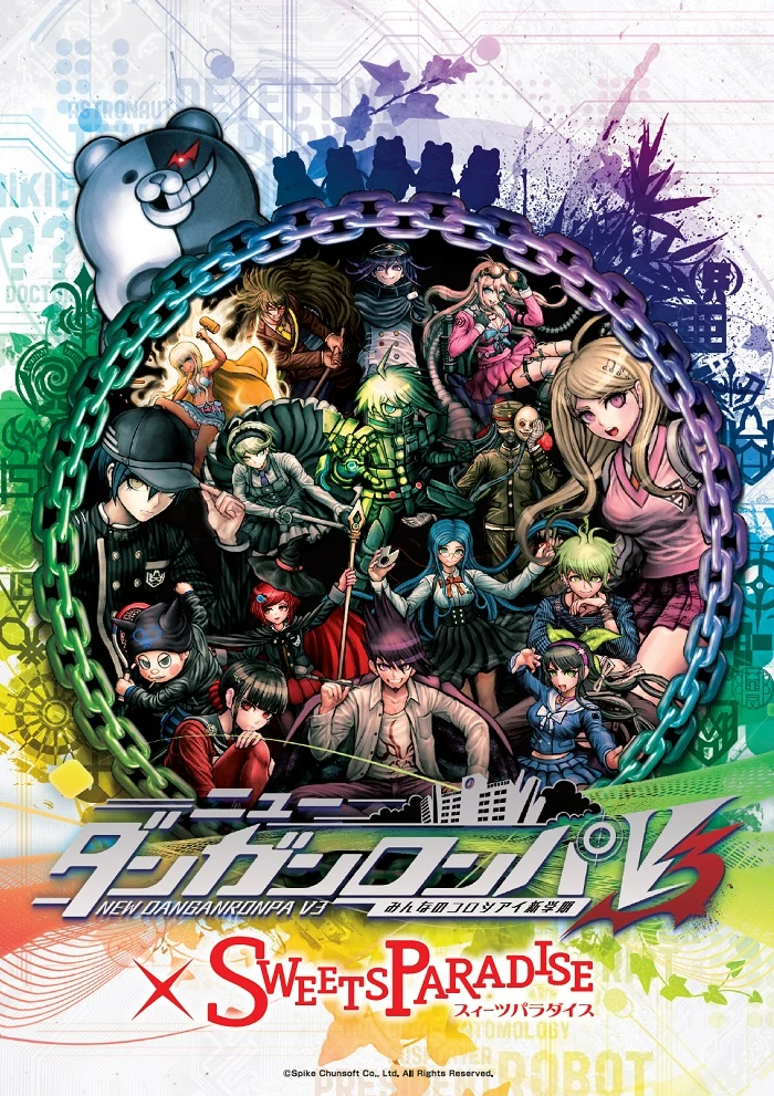The New Danganronpa V3 x Sweets Paradise Collaboration was a themed cafe collaboration effort between Spike Chunsoft and the cafe Sweets Paradise (スイーツパラダイス). It offered themed food, drinks and merchandise based around New Danganronpa V3: Everyone's New Semester of Killing as the name implies.