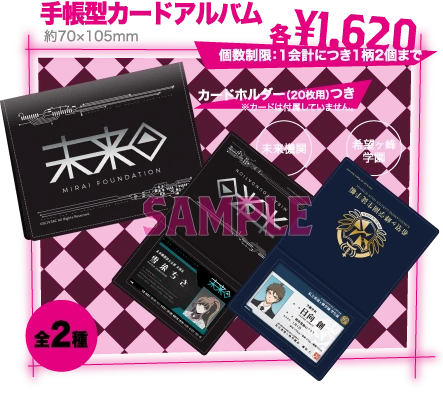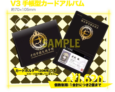 Gifted Inmates Academy Wallets and ID cards (1,620 yen) A black wallet with the Gifted Inmates Academy Gold Emblem on its frontage and on the inside, containing Akamatsu Kaede's ID card. |