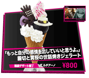「もっと自分の感情を出していいと思うよ。」 Kirigiri Kyoko & Kizakura Koichi's caramel gelato (800yen) A strawberry parfait garnished with various edible features such as Kirigiri Kyoko's glove and Kizakura Koichi's hat. |