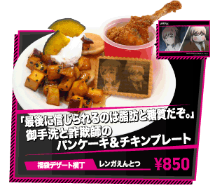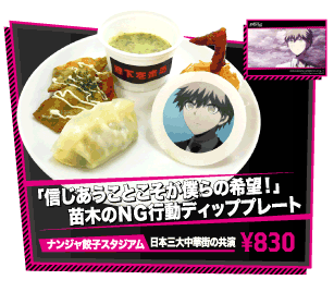 | 「信じあうことこそが僕らの希望!」 Naegi Makoto's NG Code dip plate (830yen) An assortment platter themed after Naegi, contents include soup, pasty, samosa's and Makoto themed plate |