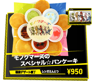 | Monokumarz ☆ Special Pancake (950yen) An assortment platter of pancakes with a variety of flavored sauces imitating the color of the Monokumarz including a themed Monokumarz crepe placed on top. |