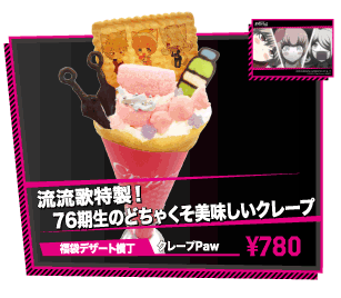 SHSL Pianist & SHSL ??? Crepe (780yen) A strawberry and kiwi parfait featuring a crepe of Amami Rantaro and Akamatsu Kaede. |