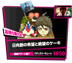 日向創の希望と絶望のケーキ Hinata Hajime's cake of hope & despair (850yen) A combo dish that is themed after Hajime and Izuru with an edible Chiaki's hair pin. |