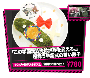 「この学園から俺は世界を変える。」 Graduation ceremony Gyoza (780yen) A themed dish that is after Juzo, Munakata, and Chisa which everything can be edible and delicious. |