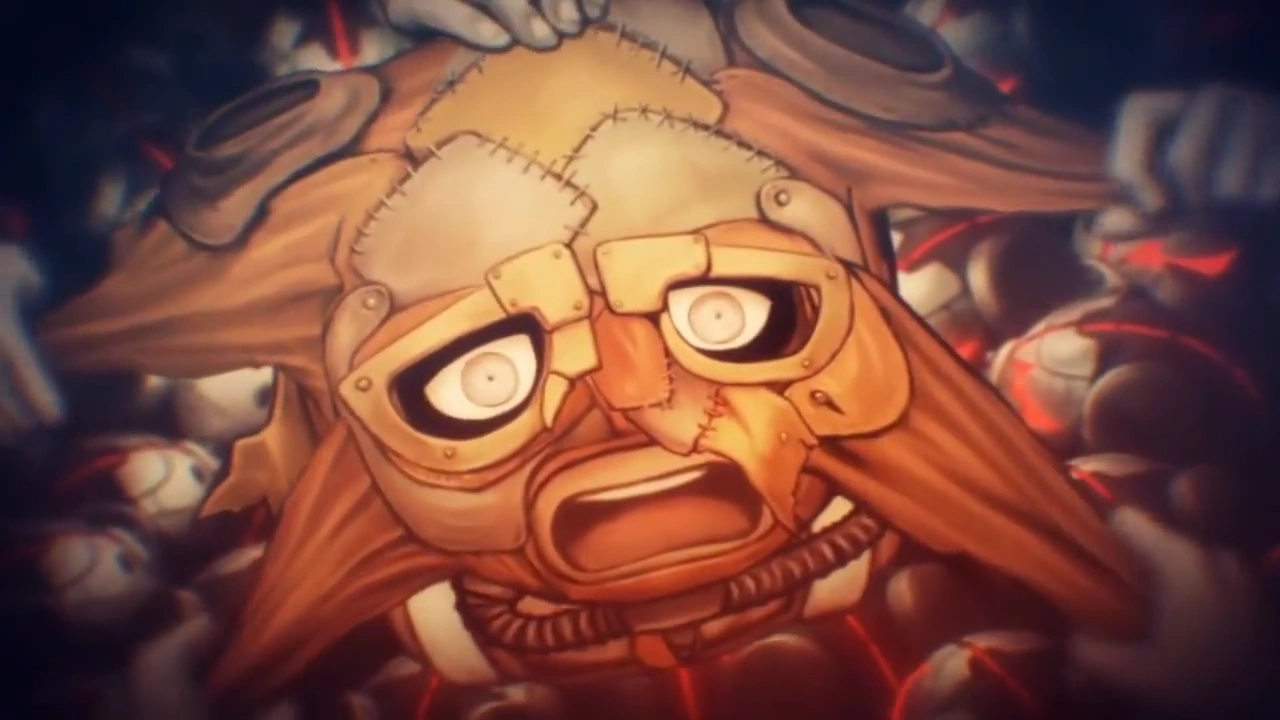 Meanwhile, Nagisa is completely unaware of what is happening because he is staring at the joysticks he is frantically swinging about before looking up and seeing the robot's arm and screaming moments before being crushed by the robot, where it finally explodes into a skull. | |