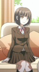 When she was in the motivational video with her parents in the first game and its corresponding anime adaption, her hair appeared neater in a classic bob cut, and she did not possess an ahoge. The uniform she wears in this video consists of a white button-up shirt, a brown blazer, a brown skirt, and a red ribbon.
