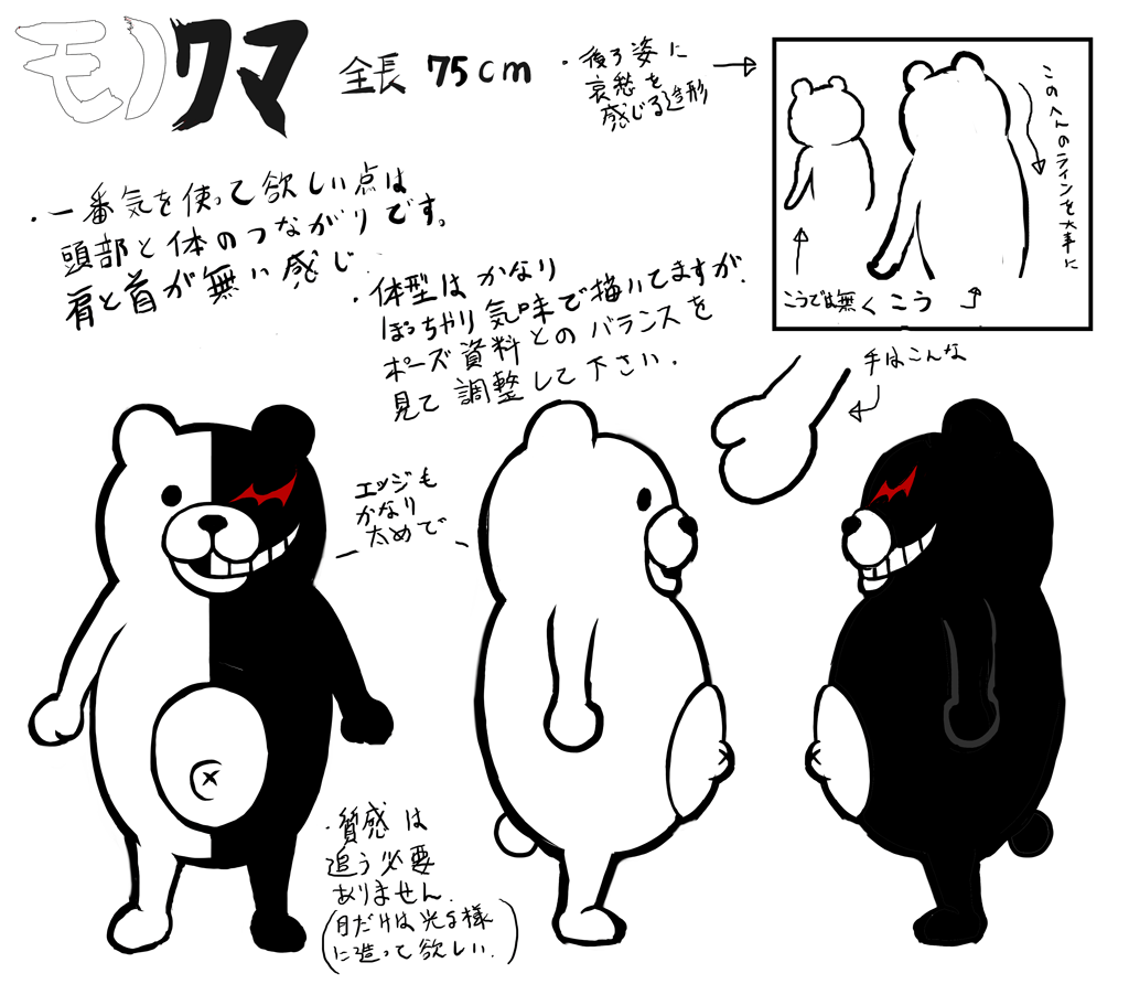 Monokuma is based on the idea of guilty (黒, literally "black") and innocent (白, literally "white"). His first beta design showcased him resembling an anatomy model commonly used in science courses. His "white" and "black" sides were originally a fully skinned side and one that exposes muscle and organs.