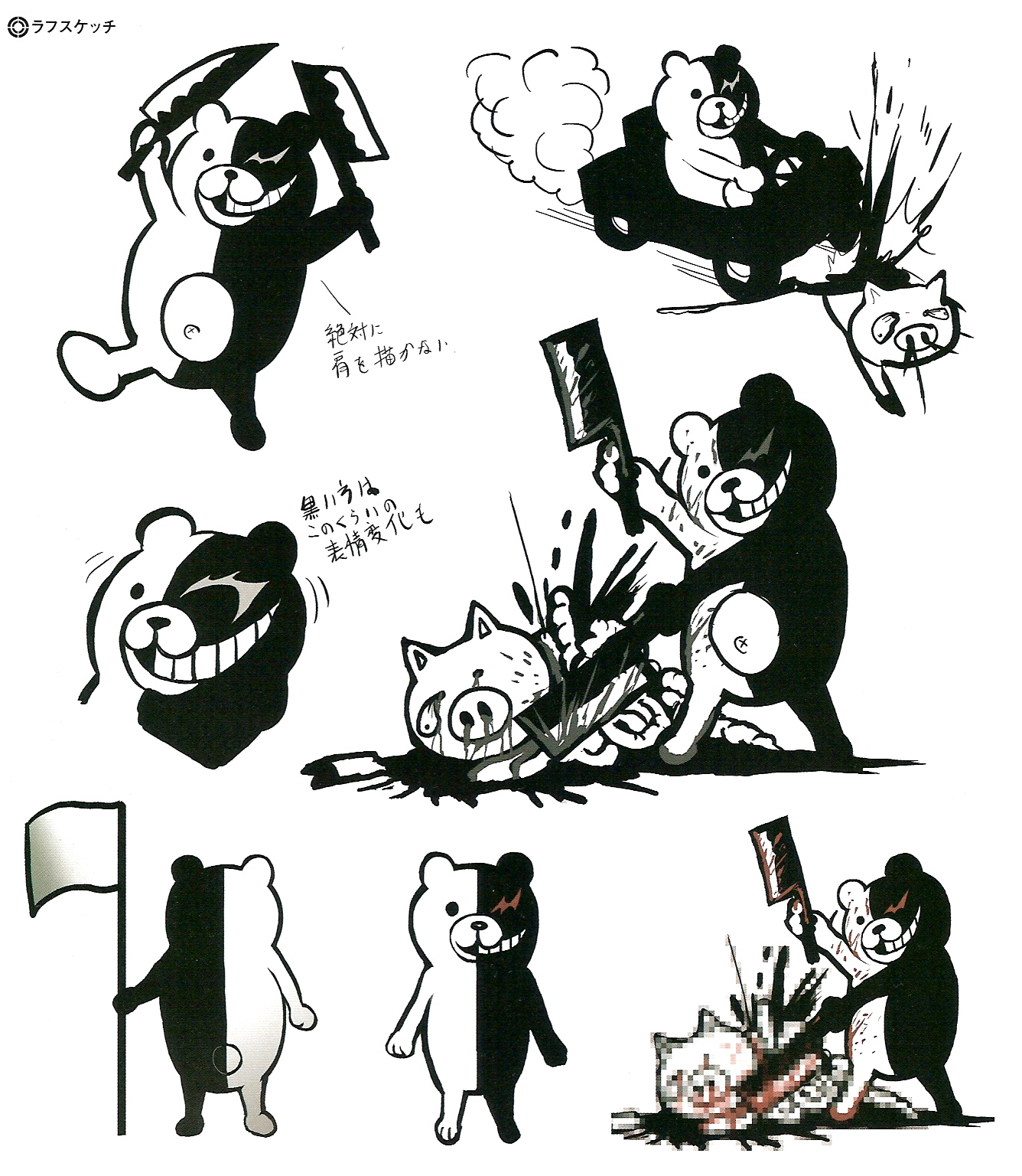 Another beta design showed Monokuma was also shown to be driving a car and carrying a pair of knives with him while chopping a pig into pieces.