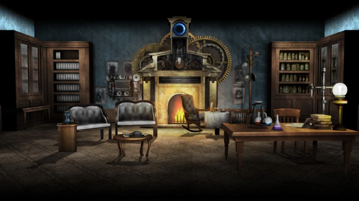 The Ultimate Detective Lab (超高校級の探偵の研究教室) is first found in Chapter 4. This lab belongs to Shuichi Saihara and is located on the fifth floor of the academy. It has a rustic, old-fashioned feel to it. A rocking chair is sat nearby a burning fireplace, and a work desk with scientific equipment and books stacked on top. Present is a large cabinet full of poisons and various other things, along with a hat rack, showcasing several bowler hats. Furthermore, his room contains a bookshelf with files detailing presumably every murder in all Danganronpa series to the 52nd, as "the newer files have photographs, but the older ones have illustrations."