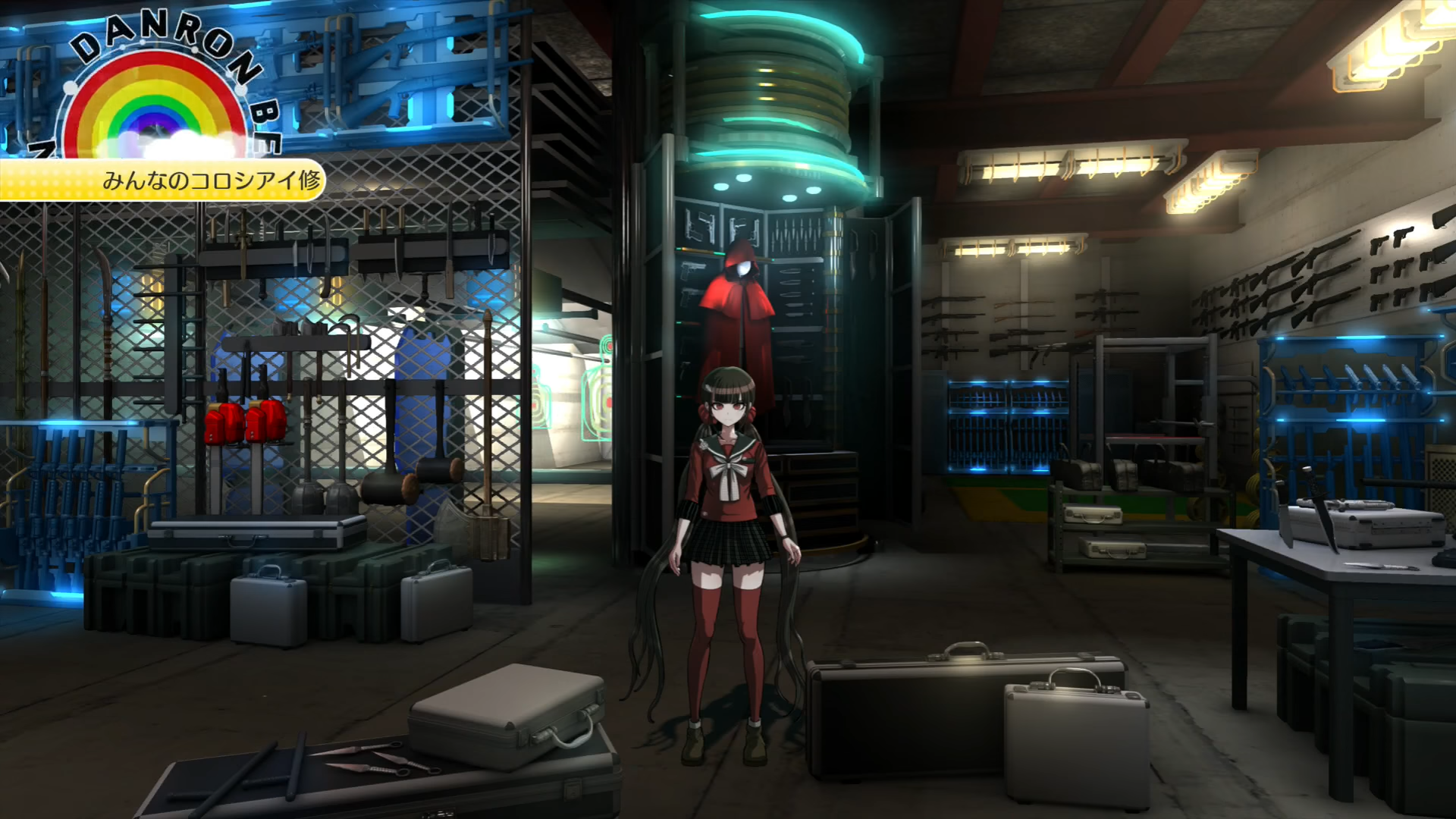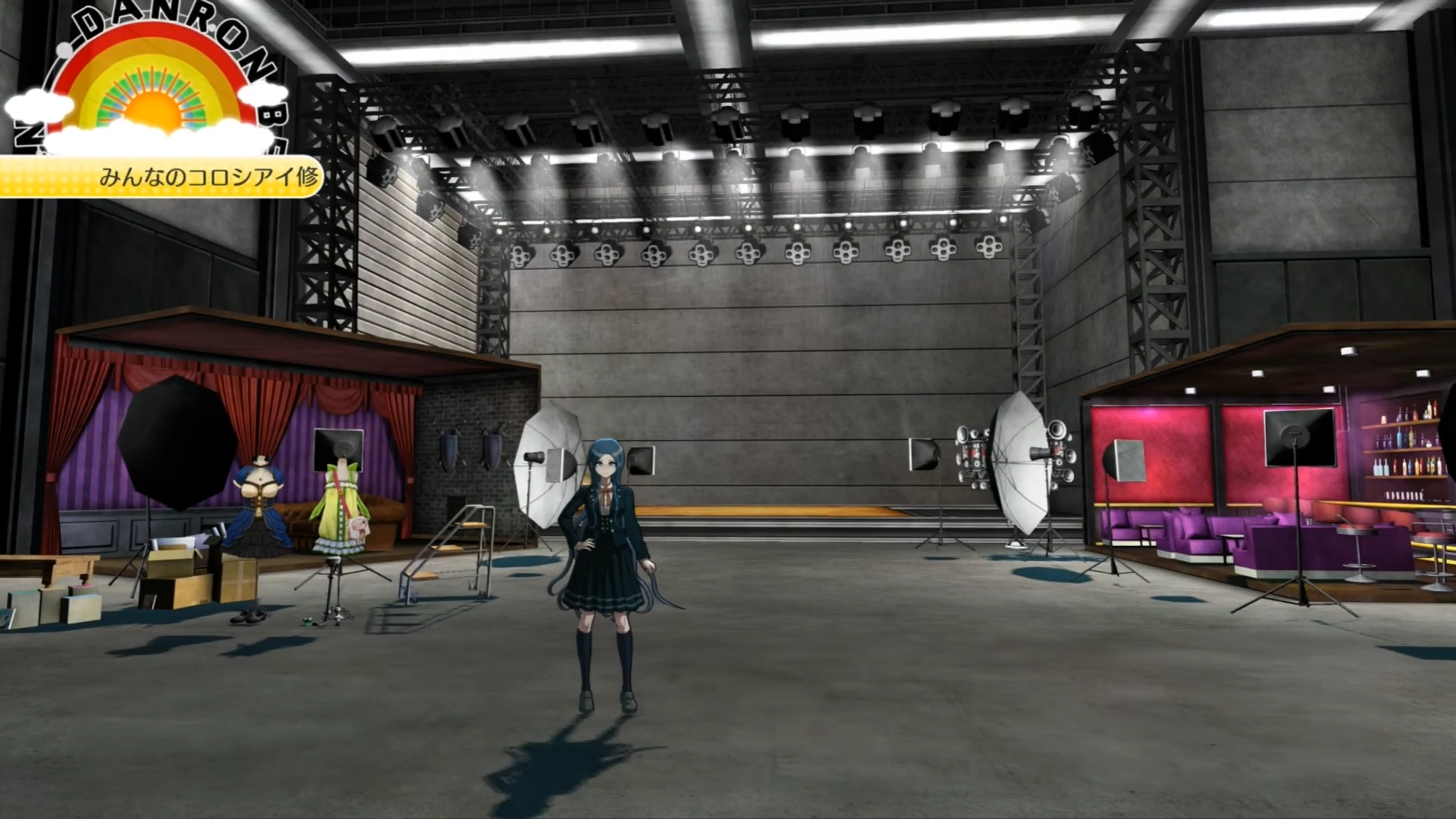 The Ultimate Cosplayer Lab (超高校級のコスプレイヤーの研究教室) is first found in Chapter 4. This lab belongs to Tsumugi Shirogane. It is located on the fifth floor of the academy. Her lab is a large warehouse lacking any color, with several stage sets for cosplaying in swapping at the back. She has a set for a bar, and a darkly colored one with a couch. Lights and cameras are facing the switching sets in the back, and she has two cosplay outfits out in the open.