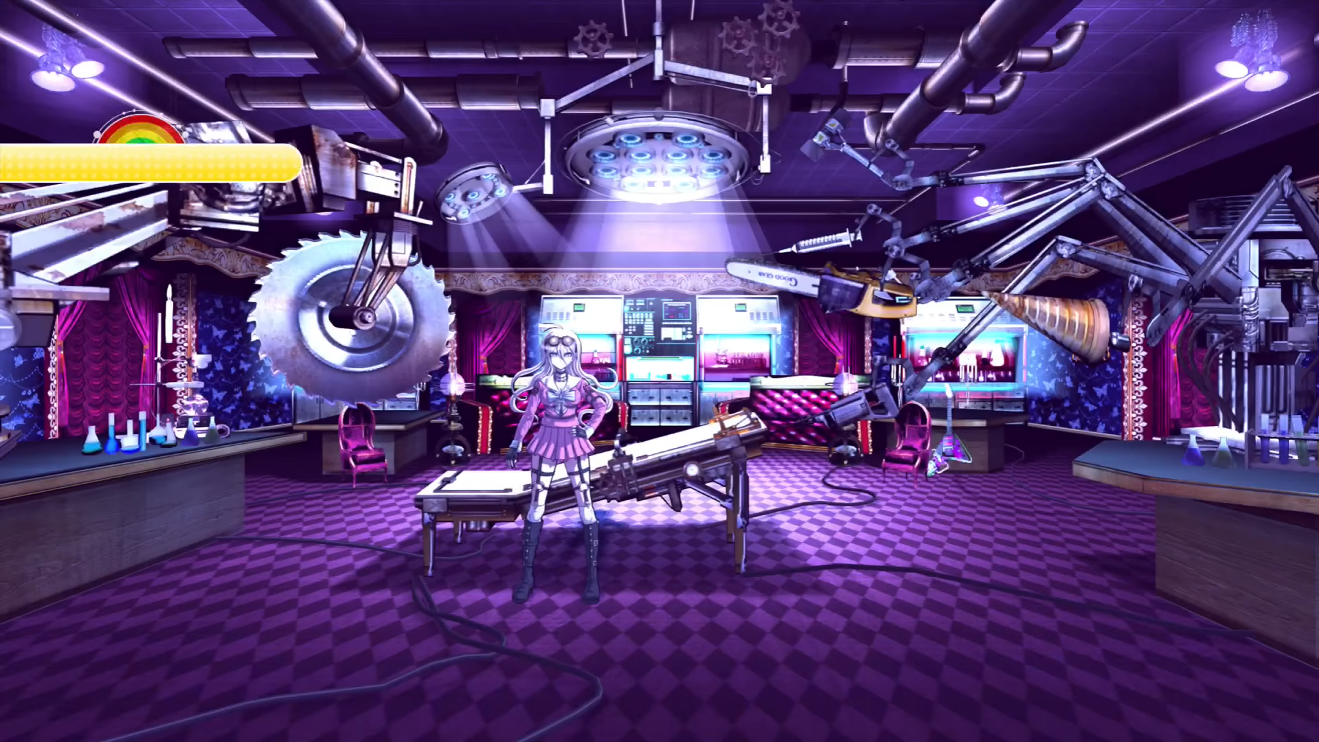 The Ultimate Inventor Lab (超高校級の発明家の研究教室) was unlocked in Chapter 1, though the player cannot enter it until Chapter 2. It is located outside the school building, near the Shrine of Judgement. It is packed with large, dangerous looking tools such as chainsaws and drills that hang from the ceiling, as well as what appears to be a bed to perform experiments on, and tables that hold chemicals. There is also large screens on the back wall and fancy looking chairs and couches. This lab belongs to Miu Iruma.
