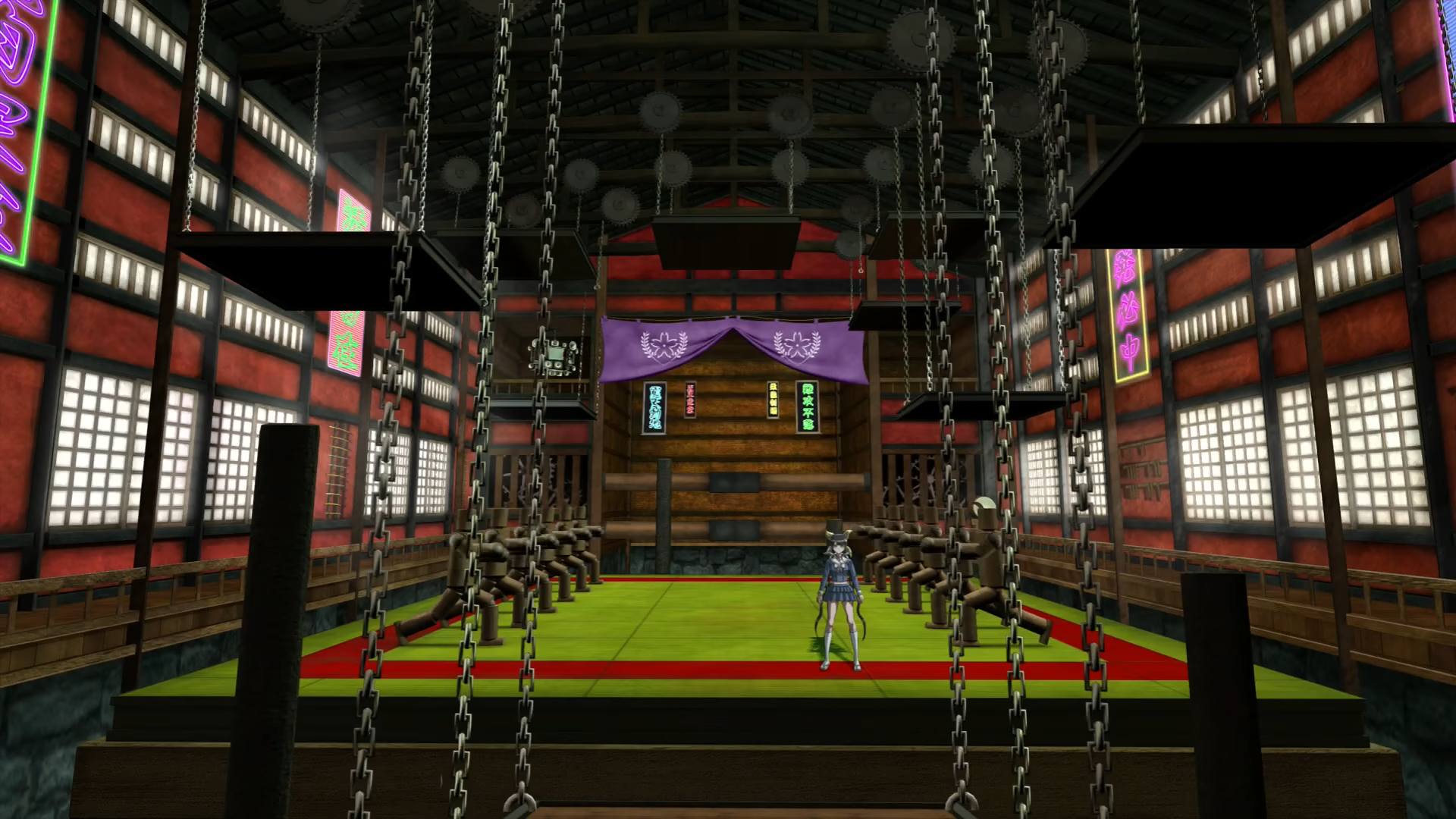 The Ultimate Aikido Master Lab (超高校級の合気道家の研究教室) is first found in Chapter 3. This lab belongs to Tenko Chabashira. It is located in the courtyard, next to the Shrine of Judgement. It's a large and spacious dojo with several platforms hanging by chains to the ceiling, and several automated-moving practice dummies to spar with. A large purple banner hangs in the middle with a logo resembling the patterns in Tenko's bow. In Chapter 4, Himiko, Gonta, and Shuichi practice Aikido in a bonus event after her death to honor her.