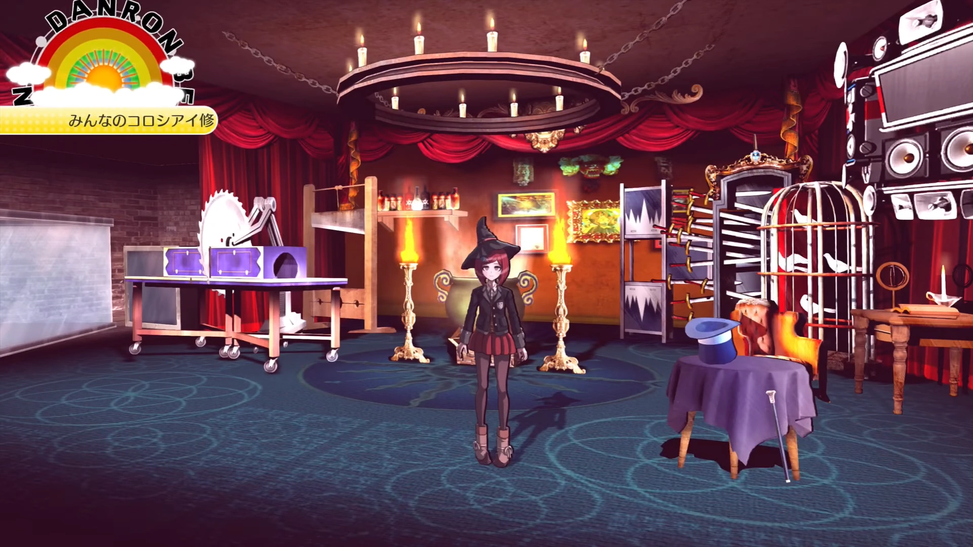 The Ultimate Magician Lab (超高校級のマジシャンの研究教室), belonging to Himiko Yumeno, was first found in Chapter 2, after the hallway leading up to it was opened. It is located on the ground floor of the academy. The door to it is blue, with a magical insignia inscribed on it. Inside the lab, there is a brewing pot in the center, which Himiko says she stores her Mana in, a guillotine, a cage with four doves in it, and multiple contraptions meant to show during a magical show.