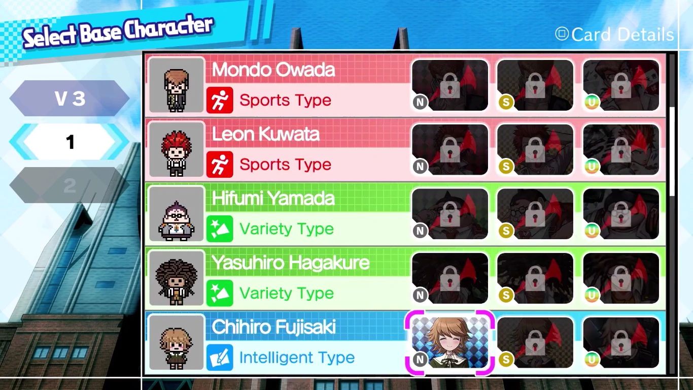 Danganronpa: Trigger Happy Havoc, Danganronpa 2: Goodbye Despair, and Danganronpa V3: Killing Harmony characters are all in separate Ultimate Death Card Machines, and you can select which machine you wish to spend your currency on. A "complete" machine is one in which all character cards for that particular machine have been collected in all 3 ranks.